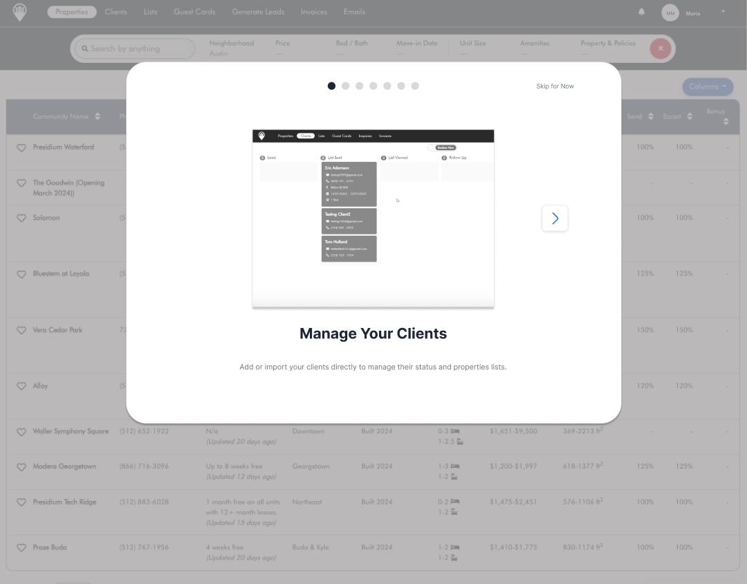 To better understand SparkAPT’s user base—agents helping clients with apartment searches—we set out to explore their workflow. We asked questions about the tools they use, how they manage clients, their preferred devices, their understanding of SparkAPT’s functionality, and how they perform tasks like sending properties to clients.