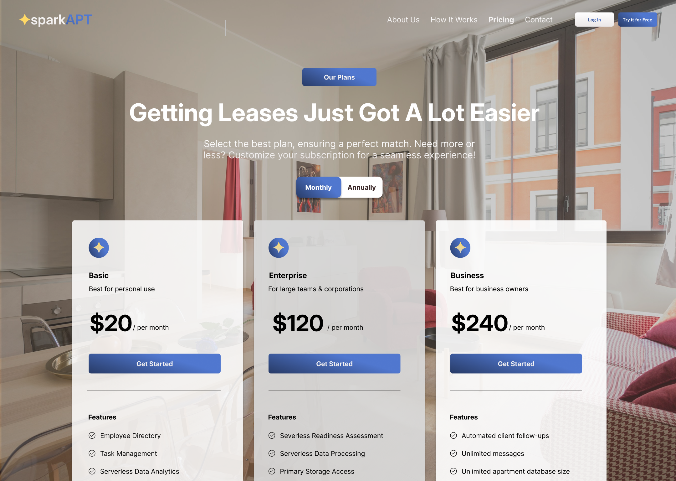 The goal here was to tackle the major issues SparkAPT was facing and we did so through a bold design for our landing page, which is evident in the mid-fidelity prototype. This page prominently displays various sections that highlight the product's features, functionalities, and FAQs, offering users a clear understanding of what they're getting before signing up.
