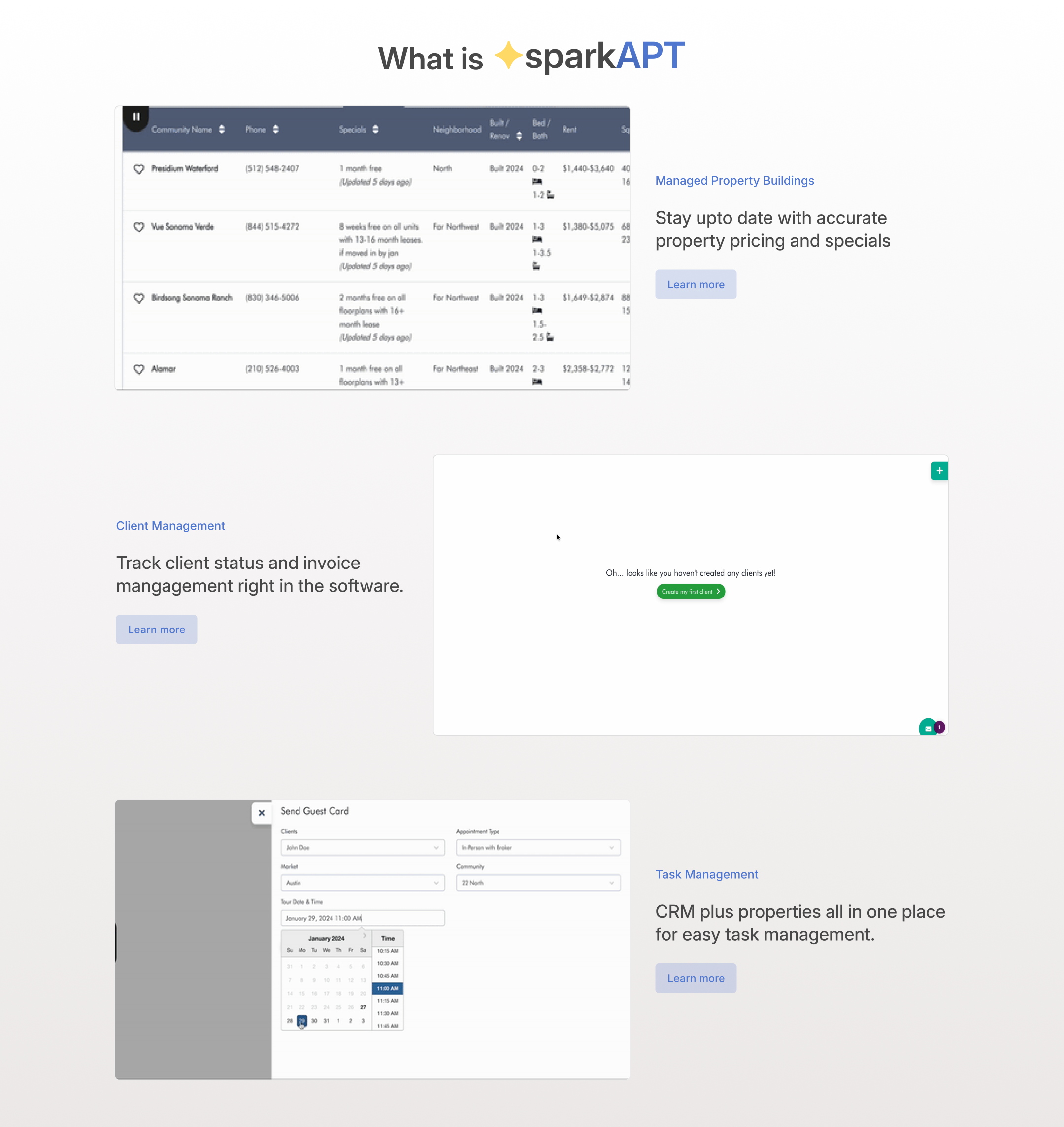 SparkAPT is a B2B SaaS company that offers a software solution for agents and brokers to automate client management + the apartment locating experience.